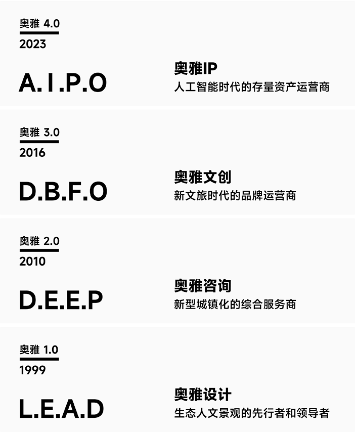 經(jīng)過多年的戰(zhàn)略布局與發(fā)展,在李方悅女士的推動下,奧雅股份從一家設計企業(yè)成功轉型成為新銳的輕資產文旅開發(fā)運營企業(yè)。奧雅以“創(chuàng)造更美好的人居環(huán)境”“讓空間賦予生命”為使命,以雙輪驅動+雙引擎為發(fā)展格局,即創(chuàng)意設計+親子文旅雙輪驅動、AIGC+IP雙引擎;經(jīng)營業(yè)務范圍涵蓋創(chuàng)意設計、親子文旅、數(shù)字科技等領域,為城市更新、鄉(xiāng)村振興、文化古城等不同場景提供全程化咨詢與綜合運營服務。在實現(xiàn)企業(yè)價值和理想的同時,解決當代中國的實際問題與需求,創(chuàng)造具有地域特色、人性化和充滿活力的新舊城市空間和綜合文化旅游項目。
